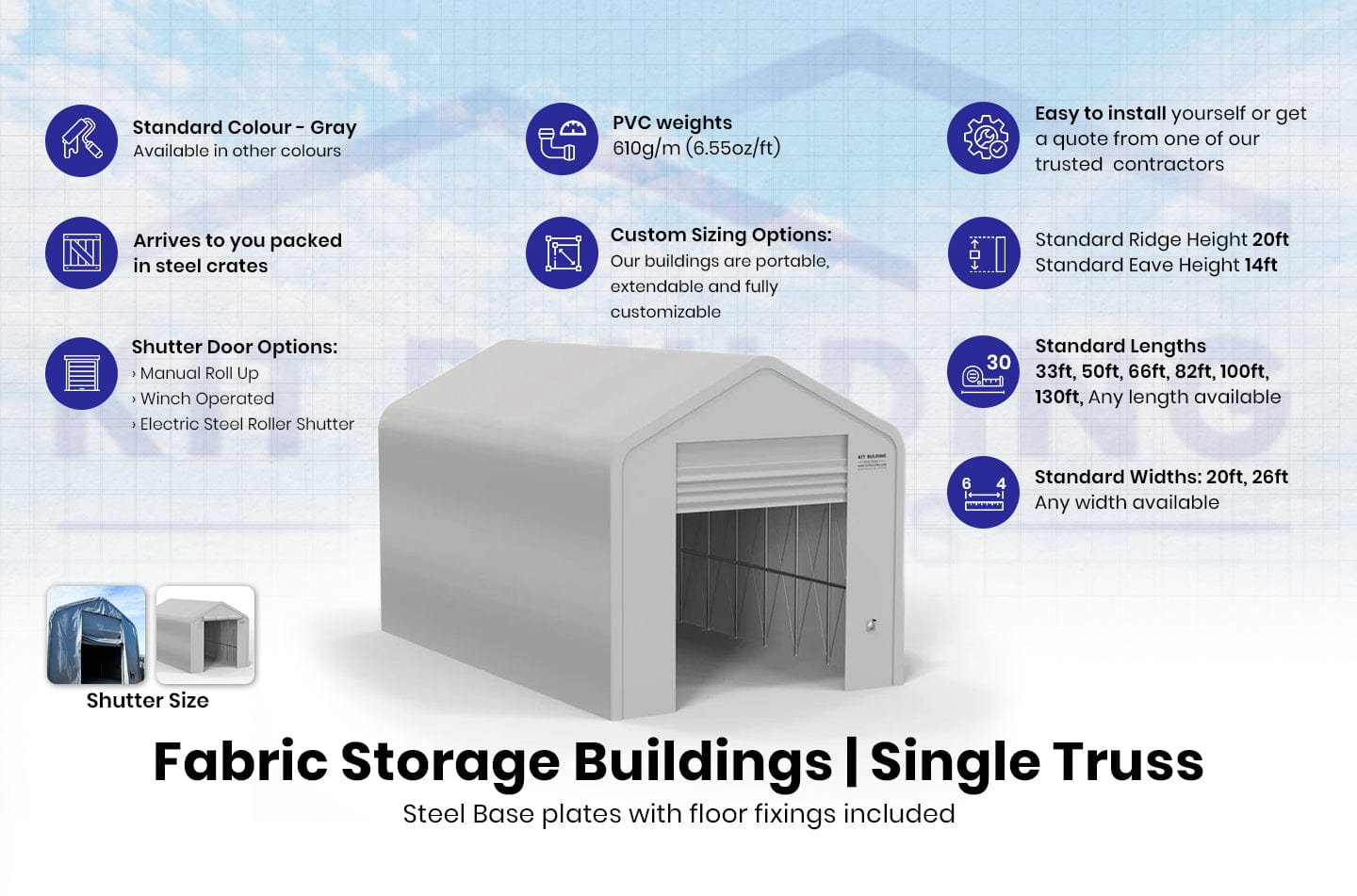 No Kit Buildings, usamos apenas materiais de alta qualidade para garantir que nossas estruturas sejam duráveis, funcionais e construídas para durar. Todos os nossos edifícios são construídos com estruturas de aço galvanizado para força superior e resistência à corrosão. Dependendo do modelo, oferecemos uma variedade de opções de revestimento, incluindo tecido de PVC retardante de fogo e resistente a UV, e chapas de aço em perfil caixa. Para edifícios isolados, você pode escolher entre isolamento EPS, Rockwool ou PIR para atender às suas necessidades específicas.